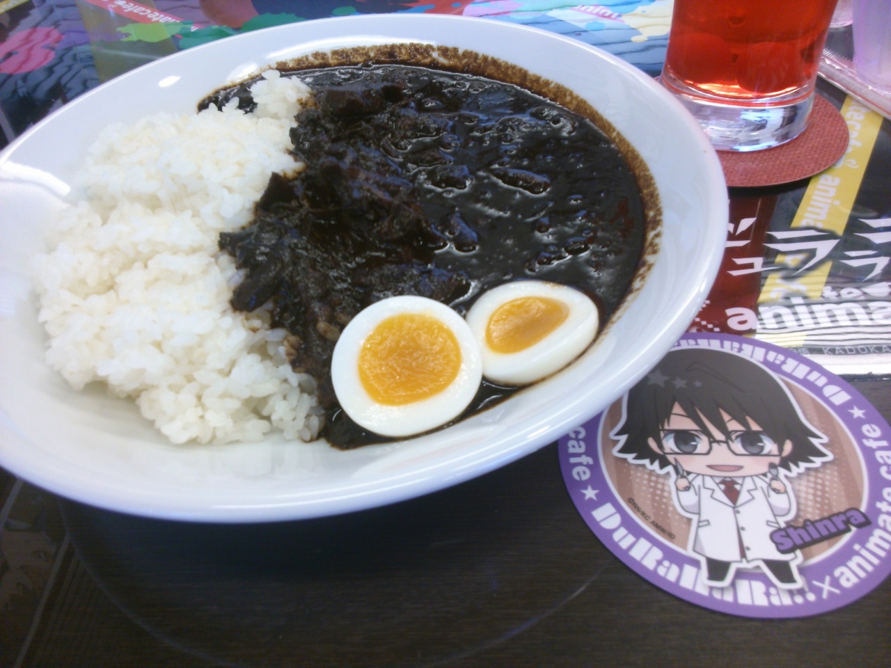 そして ブラコンカフェのあとは、予約してあったデュラララカフェ。特典は、デュラララ好きの姪っ子にあげた(^-^)。正臣ゲットで喜んでくれて良かった!!今回はガッツリ食べたよ。臨也と新羅の複雑なカレー。杏里のアセロラジュース。ジュースが写ってなかったwww。