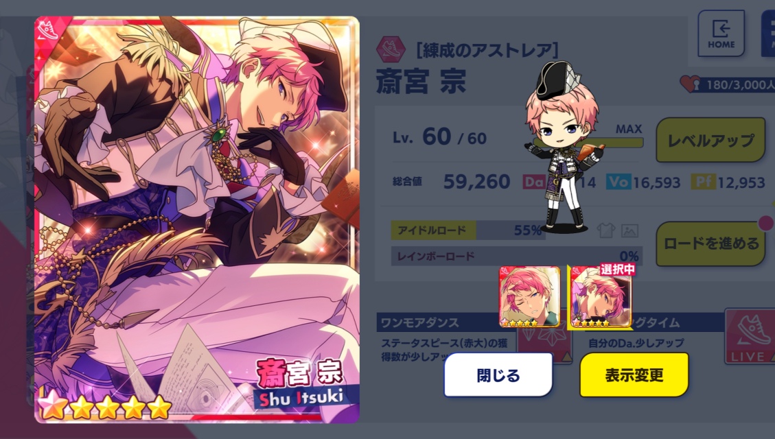 アイテム不足!! 前回結局、燐音くんをお迎えすることが出来なかったのだが、今回は10連でお師さん1枚とレオくん2枚出た(笑)。まぁ、そういうもんだwww。ってことで、お師さんを開花(^-^)。しかーし!、アイテム不足でロードが途中までしか進められんかった/(^o^)\。特に赤は毎回不足してるんだよ←学ぼうな。周回して集めなくちゃ…。